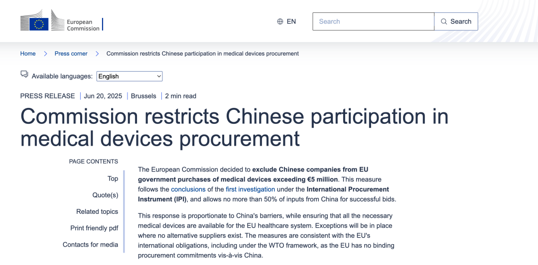 6月20日,欧盟官网发布,依据《国际采购工具》(IPI),欧盟委员会决定限制中国企业参与价值超500万欧元的医疗器械招标。